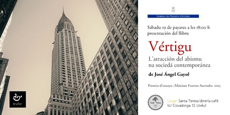 El sábadu 19 de payares a les 18:00 hores presentación del llibru Vértigu. L’atracción del abismu na sociedá contemporánea de José Ángel Gayol, Premiu d’ensayu «Máximo Fuertes Acevedo» 2015 en Santa Teresa librería café (c/ Covadonga, 11, Uviéu)