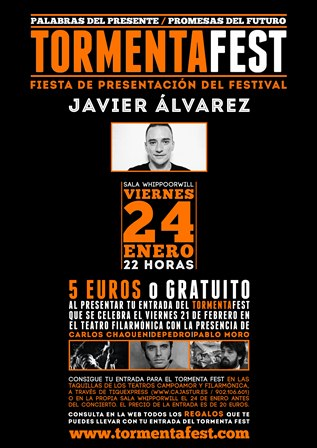 El viernes 24 de enero se celebrará a partir de las 22 horas en la Sala Whippoorwill de Oviedo la fiesta de presentación del festival. Para la ocasión y tras muchos años sin tocar en Asturias, ofrecerá un concierto Javier Álvarez, uno de los músicos más aclamados del panorama nacional durante los años 90 y que continua teniendo una intensa actividad creativa. La entrada costará 5 euros, aunque se podrá acceder de manera gratuita presentando la entrada para el TORMENTA FEST o adquiriéndola allí mismo.