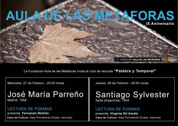 La cita con Jose María Parreño será el próximo miércoles, 27 de febrero, presentado por Fernando Beltrán y el encuentro con Santiago Sylvester será el jueves, 28 de febrero, presentado por Virginia Gil Amate. Ambos recitales se enmarcan en el ciclo de lecturas “Palabra y Temporal”, organizado por la Fundación Aula de las Metáforas, y se desarrollarán a partir de las 20’00 h. en la sala polivalente de la Casa de Cultura de Grado.