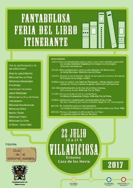 En esta ocasión la feria estará ubicada en el entorno de la Casa de los Hevia y tendrá un horario ininterrumpido de 12 a 21 horas. El sábado 22 de julio La Villa acogerá ‘Fantabulosa Feria del Libro Itinerante‘, una iniciativa que surge de la mano del Club de Editores al Margen y del Ayuntamiento de Villaviciosa.