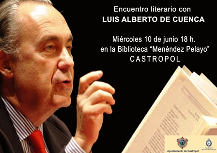 El miércoles 10 de junio a las 18 horas en la Biblioteca “Menéndez Pelayo” de Castropol tendrá lugar un encuentro literario con el filólogo, poeta, traductor, ensayista, profesor, ex director de la Biblioteca Nacional y ex secretario de Cultura, Luis Alberto de Cuenca que hablará de sus obras y sus pasiones y se tendrá ocasión de oírle recitar una selección de su extensa y premiada obra poética. La actividad es posible gracias a la colaboración de la Fundación Princesa de Asturias.