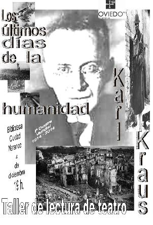 El próximo jueves, día 4 de diciembre, el «Taller de Lectura de Teatro» que tiene lugar en la Biblioteca de Ciudad Naranco hará una sesión abierta con la lectura de una adaptación de la obra Los últimos días de la humanidad, de Karl Kraus. El acto durará alrededor de hora y cuarto y comenzará a las 19:00 horas.
