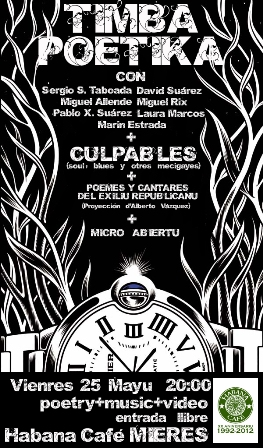 El próximo viernes 25 de mayo, a partir de las 20,00h., el Café Habana de Mieres será sede de una Timba Poétika en la que participarán autores como Pablo Antón Marín Estrada o Miguel Allende. Las “timbas poétikas” son recitales de poesía, en ocasiones con el acompañamiento de música en directo o videoproyecciones, de tono más bien reivindicativo y/o urbano. Suelen celebrarse fuera de los circuitos culturales más academicistas, visitando bares o centros sociales, donde se consigue un acercamiento más cercano y personalizado a la gente. En ellas los poetas leen textos propios o ajenos, en asturiano y en castelano, y se admite la participación de cualquier persona, así como la de autores inéditos o ya de una trayectoria consagrada.