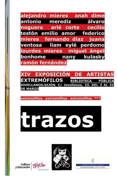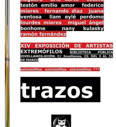 Hasta el próximo 31 de Marzo, la sala de exposiciones de la Biblioteca Pública “Jovellanos” de Gijón acoge Trazos, la XIV exposición organizada por el colectivo de Artistas Extremófilos, vinculados a la Sociedad Cultural Gesto.El propio título de la muestra simboliza la idea que subyace en ella: la fusión entre las artes plásticas y la literatura en tanto el trazo es la primera y más espontánea forma de expresión de la mano del hombre.
