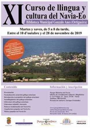 La Fundación Parque Histórico del Navia, en colaboración coa Conseyeiría d’Educación y Cultura del Principao d’Asturias, el Academia de la Llingua Asturiana y el Conceyo de Cuaña, amaña pras tardes dos martes y xoves entre el 10 d’outubre y el 28 de novembre, a undécima edición del Curso de llingua y cultura del Navia-Eo. A sede del curso será a Biblioteca Municipal Gonzalo Anes (Ortigueira). Este curso forma parte del Plan d’Actuacióis del Oficina Cultural y Llingüística del Parque Histórico del Navia en materia de normalización social del Gallego-Asturiano prá anualidá de 2019, baxo a tutela da Dirección Xeneral de Planificación Llingüística y Normalización del Principao d’Asturias.