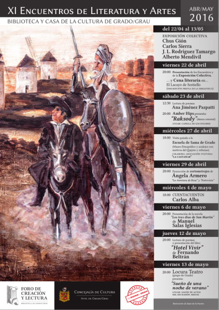 El Foro de Creación y Lectura de la Biblioteca y la Concejalía de Cultura del Ayuntamiento de Grado informan de las  actividades que dentro del  programa de los XI Encuentros de Literatura y Artes se desarrollarán en la Casa de Cultura de Grau/Grado del 22 de abril al 13 de mayo de 2016.
