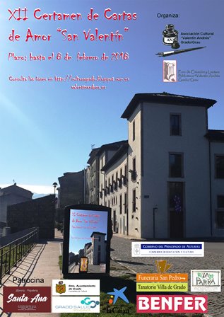 El Foro de Creación y Lectura de la Biblioteca “Valentín Andrés” de Grado/Grau (Asturias) y la Asociación Cultural Valentín Andrés, convocan el XII Certamen Literario de Cartas de Amor San Valentín, con arreglo a las siguientes bases: